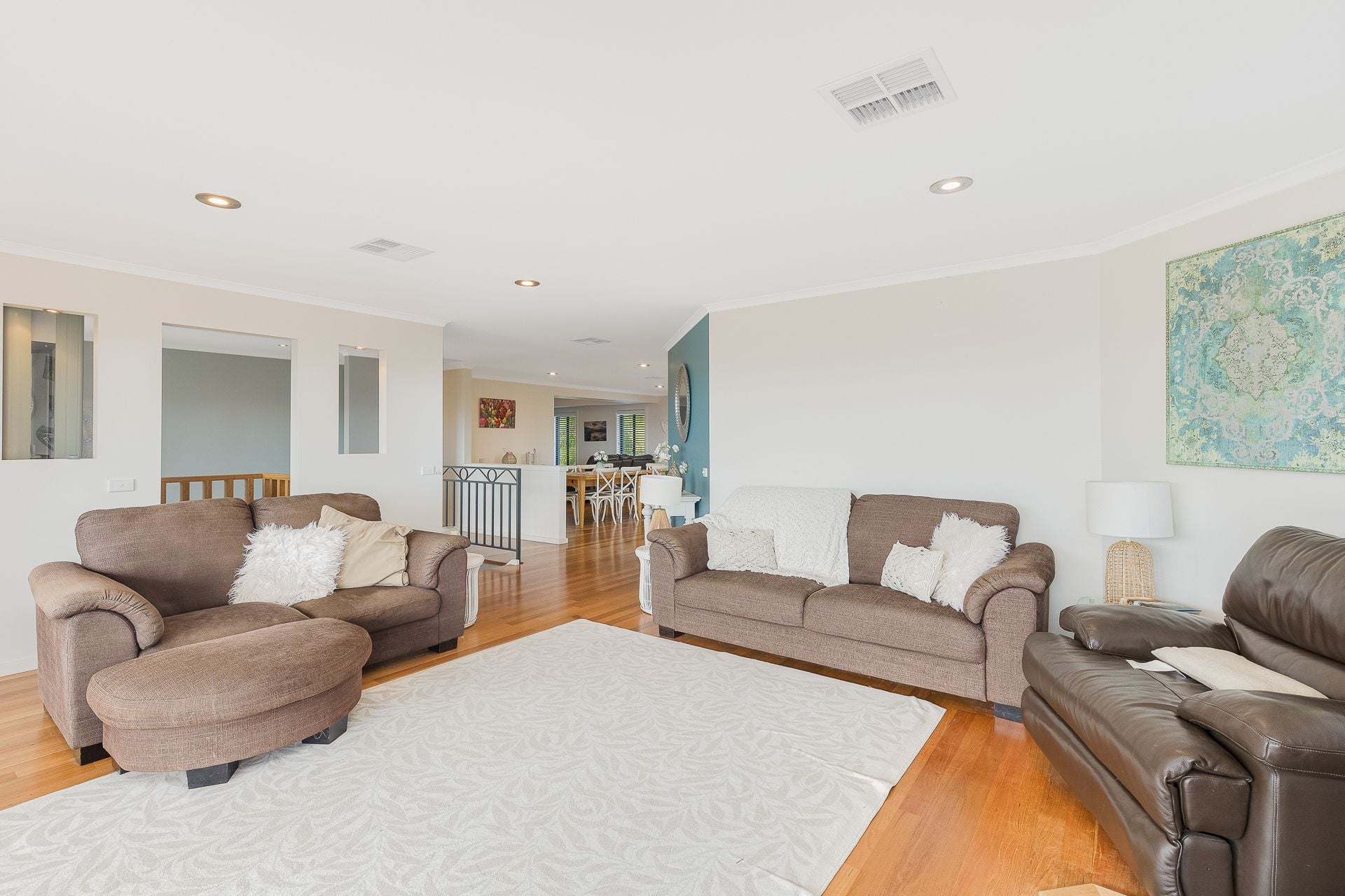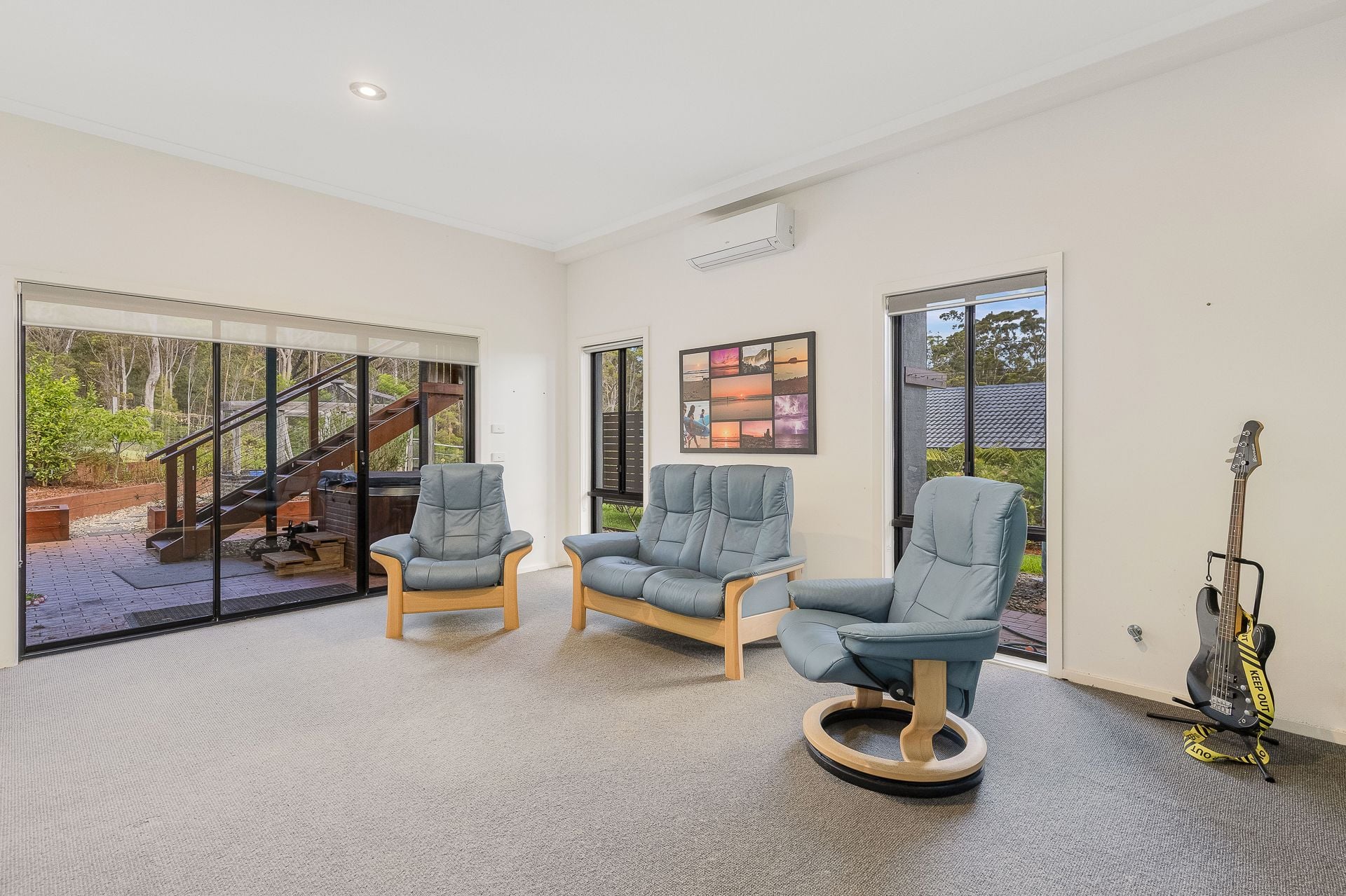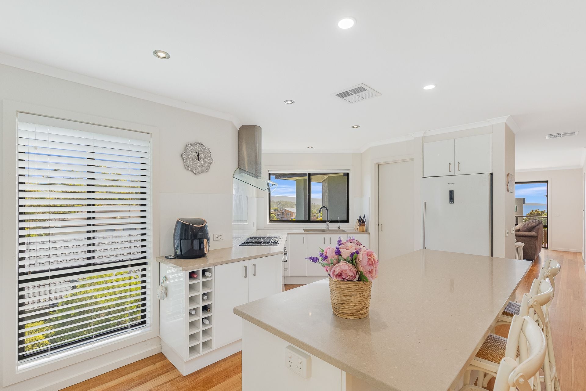 Built with quality and boasting an excellent floor plan, the home ensures space and privacy. The ground floor hosts three generous bedrooms, a practical 3-way main bathroom, and a huge rumpus room. Ascend to the upper level to discover the elegant main living areas, featuring beautiful polished timber floors, two separate living spaces for flexible family life, and a cosy slow-combustion wood fire. The open-plan dining and kitchen, complete with stainless steel appliances, is perfectly situated to enjoy the view.